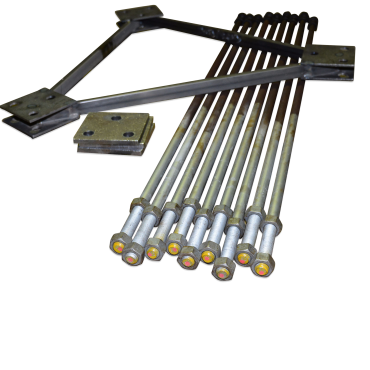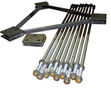 FB SEK303-00Der Staz enthält feuerverzinkte Fundamentschrauben sowie Einbettungsplatten und Muttern. Zusätzlich wird eine Gussschablone zur Befestigung der Schrauben während der Gussarbeiten und ein Fundamentvorschlag für normale Bodenbedingungen bereitgestellt.